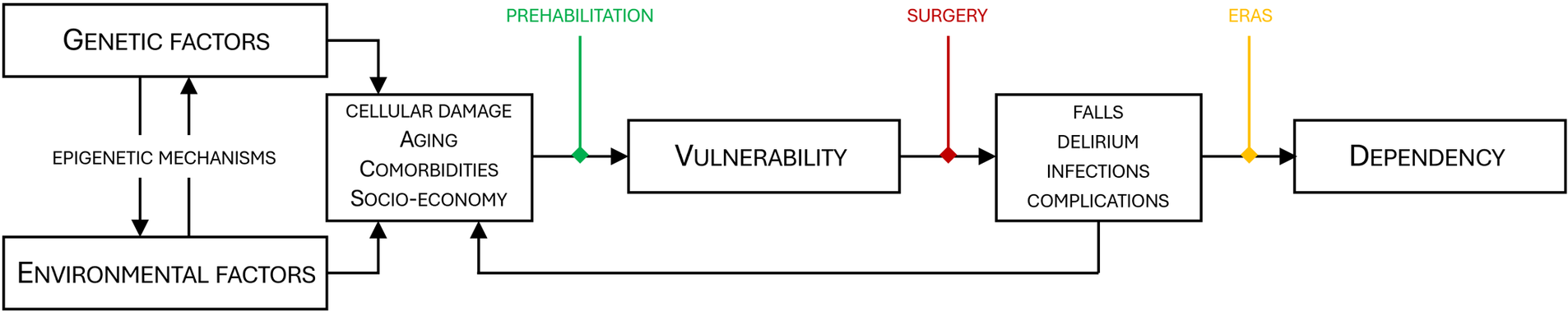 Correlation between genetic factors, environment, vulnerability and dependency. Genetics and the environment interact through epigenetic mechanisms. Over time cellular damage, aging and comorbidities are inevitable, eventually leading to increased vulnerability. Vulnerable patients have a higher risk of unfavorable outcomes after surgery, and adverse effects such as falls, delirium and complications may accelerate cellular damage and exaggerate vulnerability. For particularly vulnerable patients, the surgical trauma (red) may reduce the functional capacity below the threshold for dependency. Prehabilitation (green) and ERAS (yellow) counteract vulnerability and improve postoperative recovery thus increasing the likelihood of a self-sustained patient after surgery. ERAS, enhanced recovery after surgery.