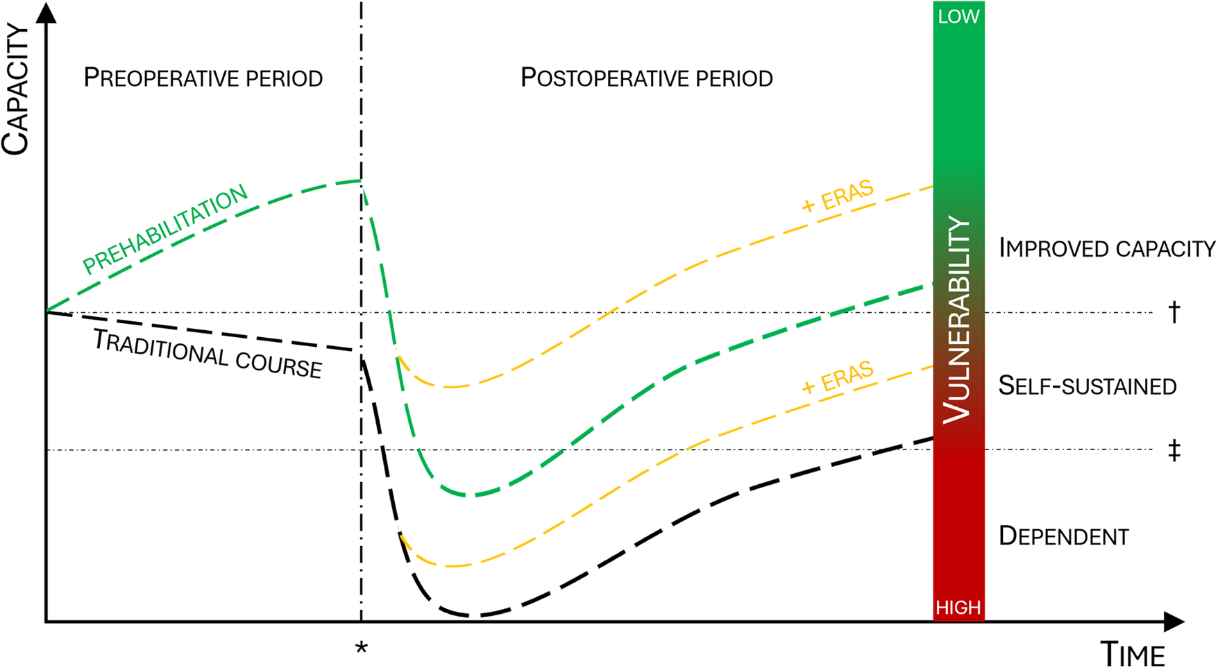 Effect of prehabilitation on surgical outcomes and postoperative level of function. When compared to the traditional course (black line) prehabilitation will increase functional capacity prior to surgery (green line) and reduce the postoperative decline. The addition of ERAS will further improve postoperative capacity (yellow line). The combination of prehabilitation and ERAS will increase the proportion of patients who stay self-sustained or improve postoperative capacity. ERAS, enhanced recovery after surgery; asterisk = time of surgery; dagger = baseline functional capacity; double dagger = threshold for dependency.