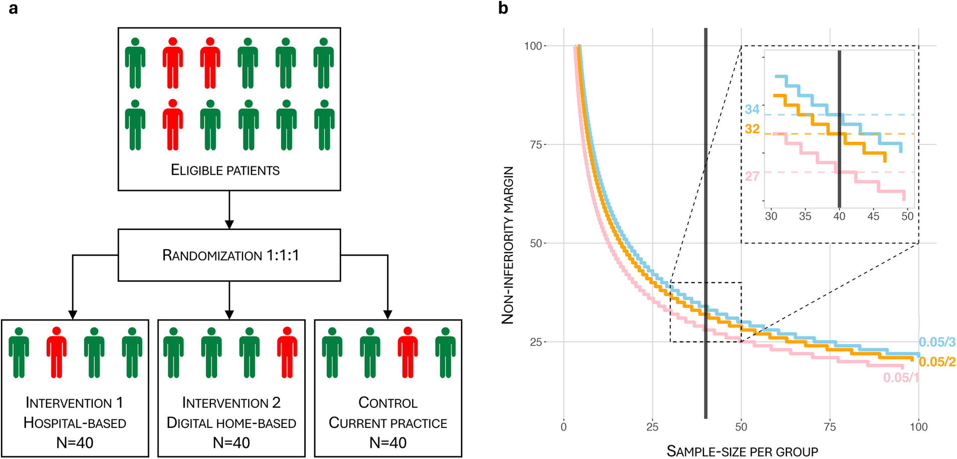 (a) randomization flowchart. Randomization is 1:1:1, stratified based on frailty measured by the Frailty Index (FI). FI ≥ 0.20 is considered frail, (red person) while FI < 0.20 is non-frail (green person). Each group will contain at least 25% (=10) frail patients. (b) Per-group sample size (N) vs. non-inferiority margin (d) for 1, 2 and 3 comparisons with corresponding Bonferroni corrections (pink, orange and blue lines respectively). The most conservative Bonferroni-corrected α = 0.05/3, β = 0.2 in a non-inferiority hypothesis setting gives a sample size N = 40 and corresponds to d = 34.
