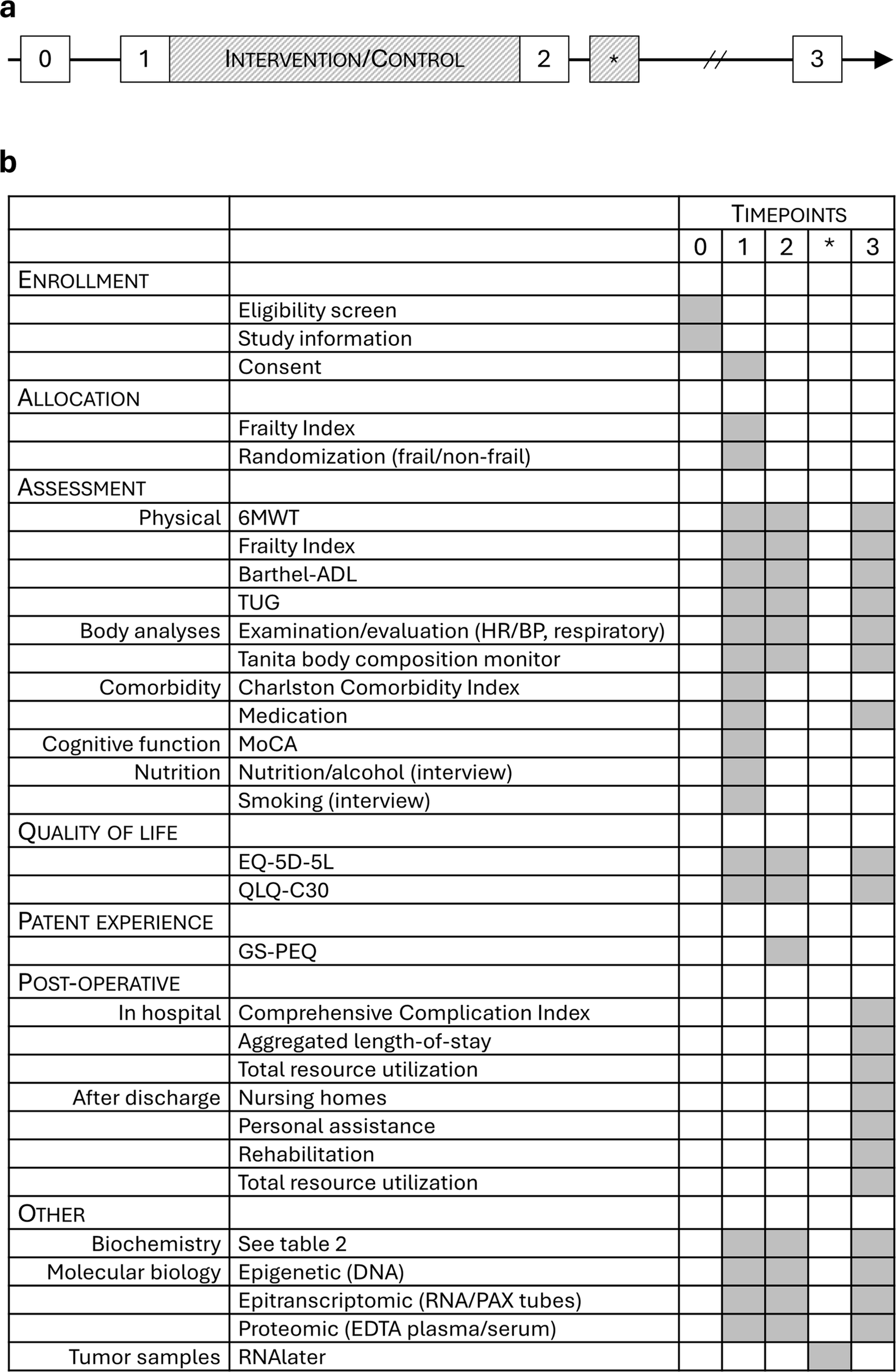 (a) trial timeline. 0 = MDT meeting/eligibility pre-screening; 1 = prior to intervention/control; 2 = post-intervention/control, prior to surgery; * = surgery; 3 = 4–6 weeks postoperatively/close-out. (b) Task table with timepoints referring to (a).