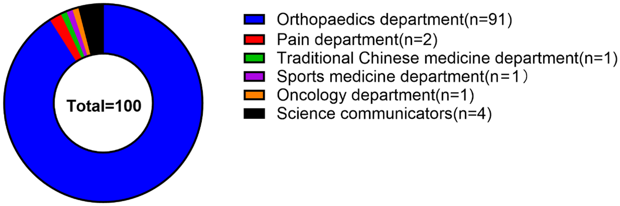 Of the analyzed videos, the majority were published by medical staff (96%, 96/100), followed by science communicators (4%, 4/100). Among the medical staff contributors, orthopedic surgeons constituted the largest subgroup (91%, 91/100). The remaining videos were distributed across other specialties, including pain medicine (2%, 2/100), traditional Chinese medicine (1%, 1/100), sports medicine (1%, 1/100), and oncology (1%, 1/100) (Figure 2).