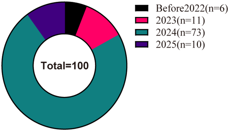 The distribution of videos by publication year showed that the largest number were released in 2024 (n = 73), followed by 2023 (n = 11), 2025 (n = 10), and the period before 2023 (n = 10) (Figure 3).