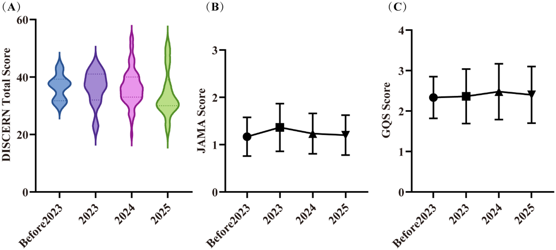 Video quality in different years. (A) DISCERN scores; (B) JAMA scores; (C) GQS scores. Error bars represent standard deviations. Part labels (A), (B) and (C) correspond to the three subplots illustrating quality scores across years (Before 2023, 2023, 2024, 2025).