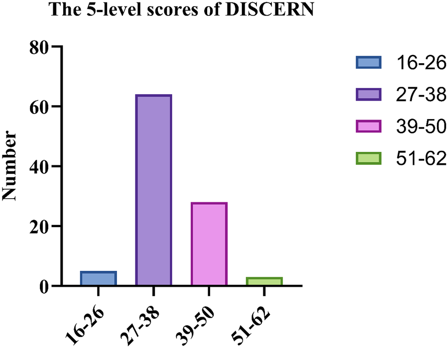 The DISCERN instrument is a reliable and validated tool designed to assess the quality of written consumer health information. It comprises 16 items divided into three sections: the reliability of the information (items 1–8), the quality of the information (items 9–15), and an overall rating (item 16). Each item is scored from 1 to 5 points, yielding a total score ranging from 16 to 80. Based on the total score, quality is categorized as follows: 16–26 (very poor), 27–38 (poor), 39–50 (appropriate), 51–62 (good), and 63–80 (excellent) (26).