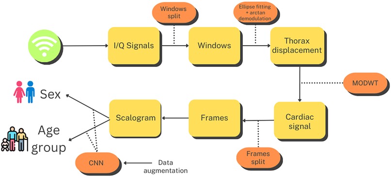 This section describes the methods employed throughout the study. A graphical summary of the workflow for this process is presented in Figure 1. The first step after capturing the I/Q quadrature signals was to divide them into 10 s windows. Subsequently, we performed preprocessing on each window, as detailed in Section 3.2, to extract a signal corresponding to thoracic movement. From this signal, we isolated the component related to the heartbeat using the Maximal Overlap Discrete Wavelet Transform (MODWT), eliminating the influence of respiration and other noise. Next, we subdivided the 10 s heartbeat signal into overlapping frames of 4 s each and generated a scalogram for each frame. These scalograms, along with additional scalograms artificially generated using a cWGAN, were then used to train a CNN that classified each scalogram into male or female categories or age groups. Finally, to derive a single prediction for each 10 s window, we conducted a voting process based on the predictions provided by the CNN for each one of its frames.