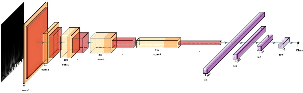 The structure of our CNN is shown in Figure 3 and consisted of 5 convolutional layers followed by 4 fully connected layers. The output was a number corresponding to the predicted class for the input scalogram. After each convolutional layer, we applied batch normalization to normalize the input and mitigate internal covariate shift [114]. The Rectified Linear Unit (ReLU) was used as the activation function to introduce non-linearity, which aids in learning complex patterns in the data. Max pooling was applied after each convolutional block to progressively reduce spatial dimensions and retain the most relevant features. The kernel sizes for the five convolutional layers were 5, 3, 13, 5, and 2 respectively, all with stride 1 and no padding. The input to the network consisted of 3-channel scalograms with fixed dimensions, and the size of the flattened feature map after the final convolutional block was 2048. The fully connected (MLP) part of the network contained layers of size 1024, 256, 64, and 1, with ReLU activations and dropout (p = 0.5) applied after each layer except the final output. The model was trained using the Adam optimizer with a learning rate of 0.001 and binary cross-entropy loss. With this model, we were able to predict the class of each scalogram, and thus of each frame. To obtain a prediction for each window, we then used hard voting based on the predictions of all the frames within that window. Nevertheless, we did not conduct an optimization process for the selected CNN architecture; therefore, alternative architectures might have yielded superior final results.