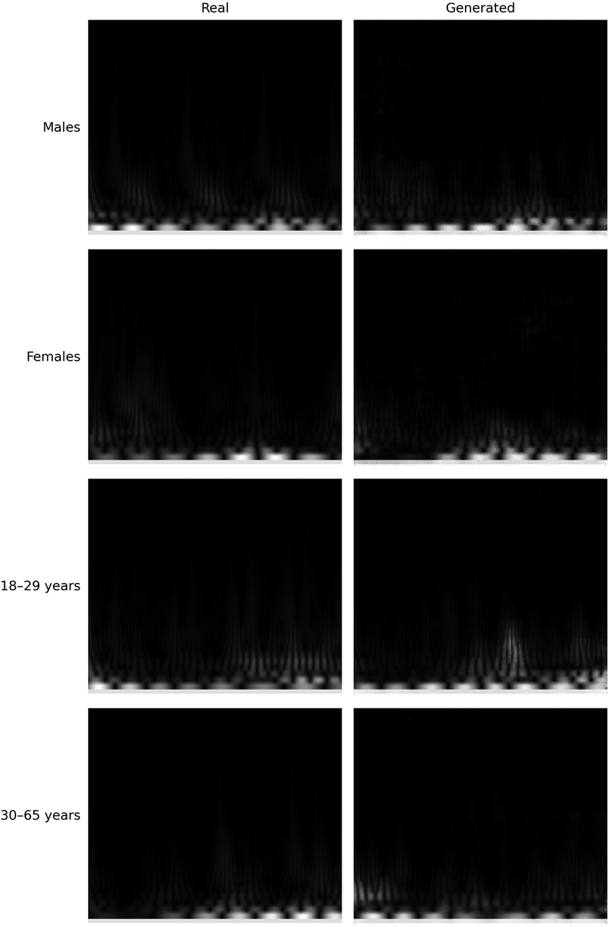 The cWGAN addressed the challenge of limited and imbalanced radar datasets by synthetically generating realistic scalograms conditioned on class labels (e.g., sex or age group). By modeling the data distribution and introducing controlled variability, the cWGAN enriched the training set with representative samples that improved generalization and reduced overfitting. This approach is particularly effective when collecting more real radar data is impractical due to time, cost, or ethical constraints. By training our cWGAN on the scalograms of patients dedicated to the training set, we were able to generate new scalograms labeled in each of the two categories: male and female in the case of sex, and 18–29 and 30–65 in the case of age. We chose this strategy instead of oversampling or undersampling to preserve the original distribution and avoid overfitting. Although other methods such as SMOTE or class weighting were considered, the cWGAN was selected for its ability to generate label-consistent and structurally realistic samples.