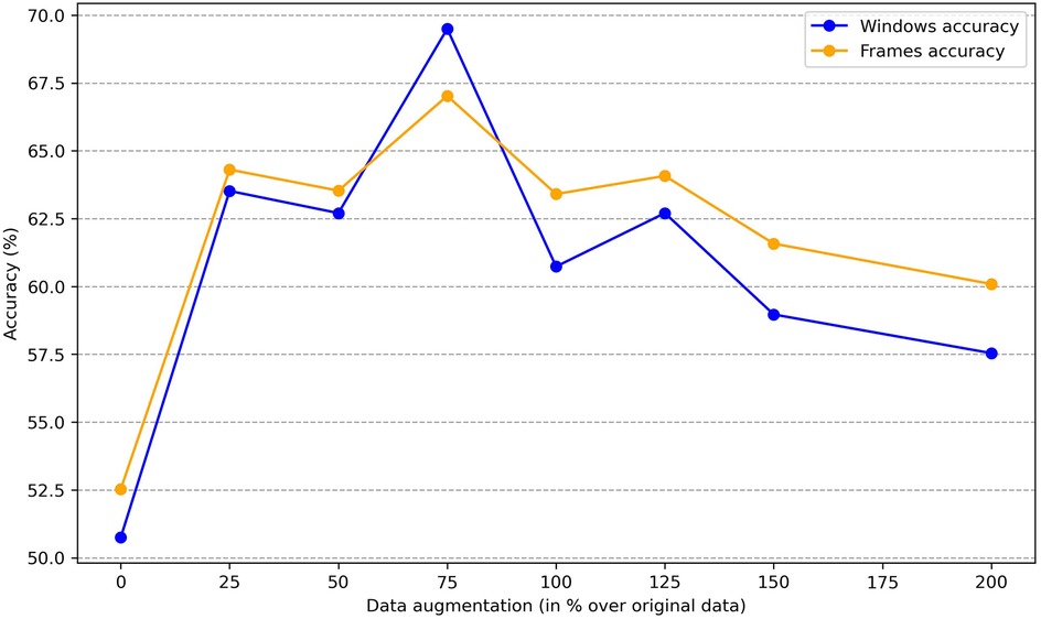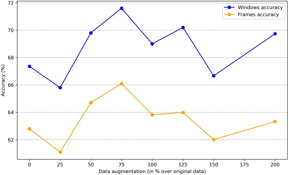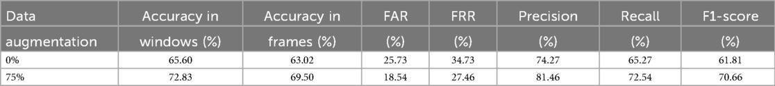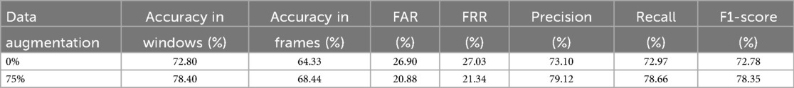 Similar to our approach with sex, we can investigate the impact of the amount of new scalograms added to the training set on the classification of test patients by age group. This analysis is illustrated in Figure 9, where the best results are obtained by training the classifier with an additional 75% of generated data. To create this plot, we performed classification four times, depicting the average results. In this figure, it is observed that the use of data augmentation does notably improve the performance of the classification algorithm between the two groups. Furthermore, the accuracy takes on a concave shape, reaching its maximum when increasing the data by 75% and decreasing thereafter. On the other hand, in Table 4, we observe the metrics comparing the results after applying data augmentation and without applying it, following the procedure described for sex using leave-one-out classification with the aim of maximizing the training data. The inclusion of 75% data augmentation resulted in a marked improvement across all classification metrics. The window-level accuracy rose from 65.60% to 72.83%, an increase of 7.23%, while frame-level accuracy similarly increased by 6.48%, reaching 69.50%. In terms of error rates, both the FAR and the FRR exhibited notable decreases, dropping from 25.73% to 18.54% and from 34.73% to 27.46%, respectively. This reduction in error rates indicates that the model becomes more reliable with data augmentation, with fewer incorrect classifications on both acceptance and rejection. Precision and recall showed notable improvements, with increases of 7.19% and 7.27%, respectively, compared to the initial values. The F1-score also rose by 8.85%, reflecting a better balance between precision and recall. As in the case of sex, we evaluated the statistical significance of the observed improvement by repeating the classification experiment 34 times and applying Welch’s t-test. The results yielded a t-statistic of 2.4017, a p-value of 0.0225, and a 95% confidence interval of [0.1067, 0.0087], indicating that the performance gain from data augmentation is statistically significant in the age group classification task.