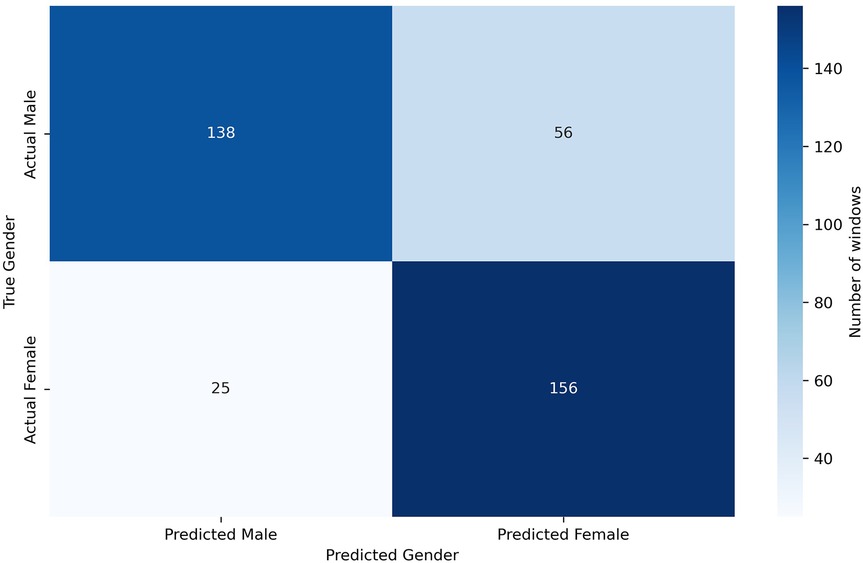 Given the limited number of subjects in the dataset, we can perform a leave-one-out classification for each of the 6 test patients, using the other five as additional training material. In this way, for each of these 6 patients dedicated for test, a model is trained with the remaining 29 patients plus the generated scalograms. The goal of the data augmentation process was to generate samples conditioned on specific attributes, thereby enhancing the model’s ability to control and manipulate the output based on desired characteristics. Table 3 presents the results obtained using this methodology, comparing the classification performance with only the original data to the performance with a 75% increase in data through augmentation. The application of data augmentation led to substantial improvements across all metrics. The classification accuracy for 10 s windows (i.e., after aggregating frame-level predictions into a single decision per window) rose significantly, from 72.80% to 78.40%, reflecting a 5.6% improvement. This enhancement demonstrates the model’s increased capability to accurately classify sex due to the added variability in the data. Frame-level accuracy (i.e., the performance of the CNN when predicting individual 4 s frames) also benefited, showing a 4.11% increase, which indicates a consistent trend of enhanced performance even at finer time granularities. In terms of error rates, both the FAR and FRR declined, with reductions of 6.02% and 5.69%, respectively, after applying data augmentation. Precision and recall also improved, with precision increasing by 6.02% and recall by 5.69%. These results suggest that the augmented dataset not only makes the model more accurate but also promotes a better balance between detecting true positives and minimizing false negatives. This balance is further evidenced by a 5.57% increase in the F1-score. All metrics reported, except for frame-level accuracy, are computed at the window level. Additionally, in Figure 6, we can observe the confusion matrix for the case where data augmentation is increased by 75%. It is important to note that we are classifying 10 s windows, which the numbers in the figure correspond to. In this figure, we can see that for the model, women are easier to identify (86.19% accuracy), whereas men present more difficulties (71.13% accuracy).