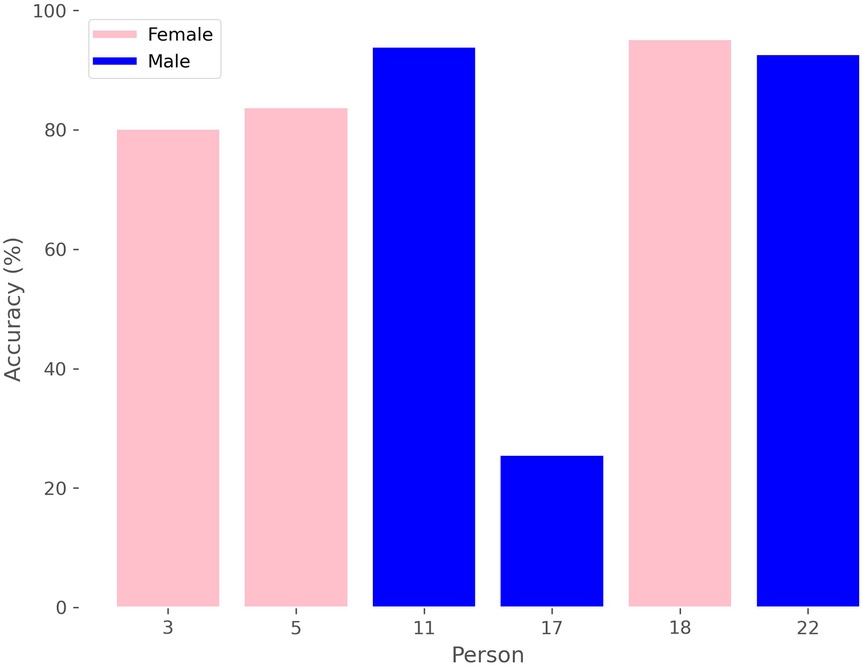 Additionally, we can analyze the accuracy of sex prediction for each window in relation to the patient, as depicted in Figure 7, where we see that there is a male whose windows are mostly classified by the model as belonging to female, thereby reducing the average results.