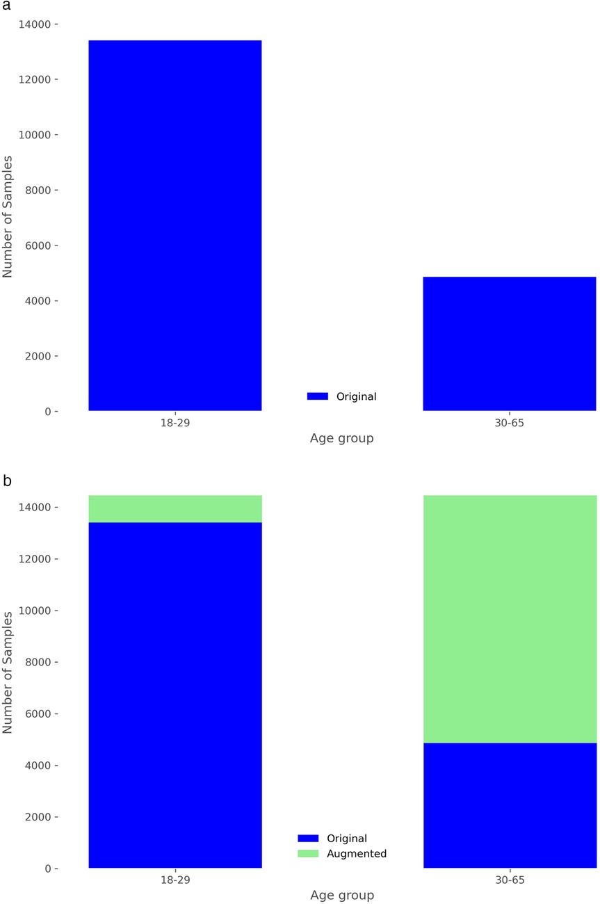 Figure 8. Distribution of frames in the training set by age group. (a) Without data augmentation. (b) After data augmentation of 75%.