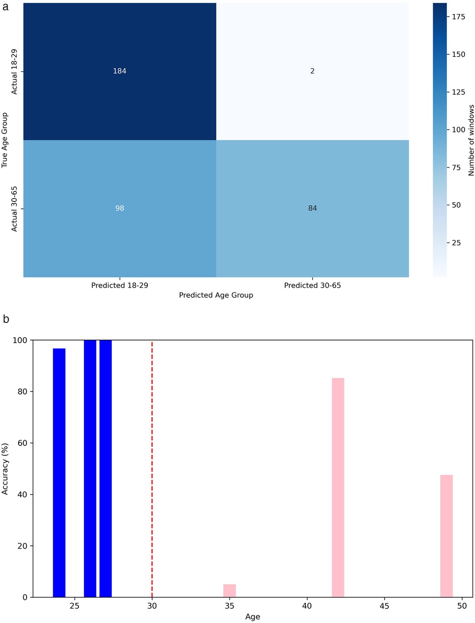 Figure 10. Performance metrics for age group classification. (a) Confusion matrix for classification in age group. (b) Accuracy in age group classification by person.