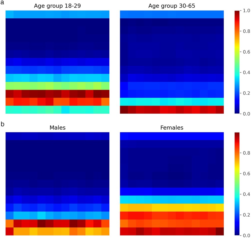 Figure 11. Grad-CAM heatmaps showing CNN attention regions on scalograms. (a) Age group classification. (b) Sex clasification.