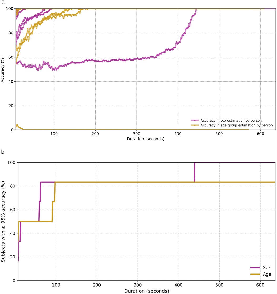 Figure 12. Classification accuracy for both sex and age group as a function of temporal aggregation. (a) Average classification accuracy per test subject over temporally aggregated subsets of varying duration. (b) Cumulative percentage of test subjects for whom the model achieves at least 95% accuracy, as a function of temporal input duration.