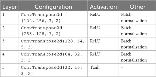 Table 1. Architecture summary of the generator in the cWGAN with 2 labels and 100 as input dimension.