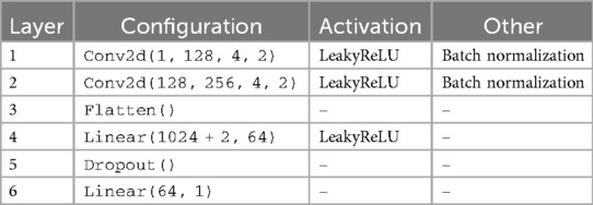 In accordance with findings from other studies [108–110], we performed data augmentation using a GAN [111], specifically a cWGAN. This kind of WGAN incorporates conditional information: both the generator and the discriminator (or critic) receive additional input, typically in the form of class labels or other conditioning variables. The architectures of our generator and critic can be seen in Tables 1, 2 respectively. We used Adam as the optimizer for the generator, and RMSprop, as recommended in [98], for the critic. Additionally, we implemented gradient penalty with a coefficient of 10 to stabilize the training process, which helps enforce the Lipschitz constraint by ensuring the gradients have a norm close to 1. For both tasks, predicting sex and age respectively, each data sample was assigned a single label.