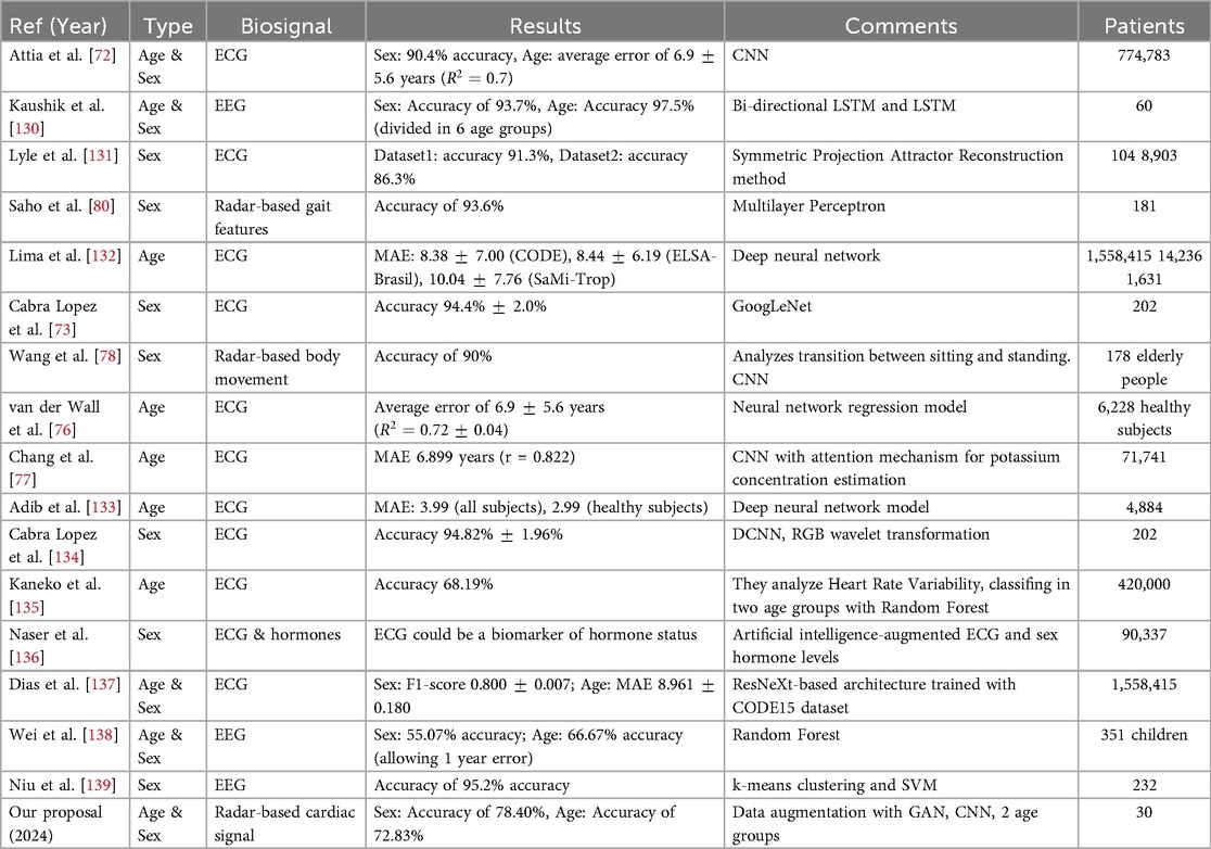 However, while traditional methods such as ECG benefit from larger datasets and have shown high performance in demographic attribute estimation, they still face challenges regarding portability, comfort, and suitability for continuous monitoring. In contrast, radar-based techniques offer a good contactless alternative but are currently limited by smaller datasets, which can affect both model accuracy and generalization capacity. Additionally, due to the novelty of this approach, further studies are required to systematically evaluate its robustness in diverse real-world settings. This comparison can be seen in Table 7, where we compare our results with those obtained through other signals, as we are not aware of previous studies conducting this procedure with this type of signal. In this table, it is observed that the accuracy in estimating sex usually exceeds 90%, and the databases used sometimes include hundreds of thousands of patients.