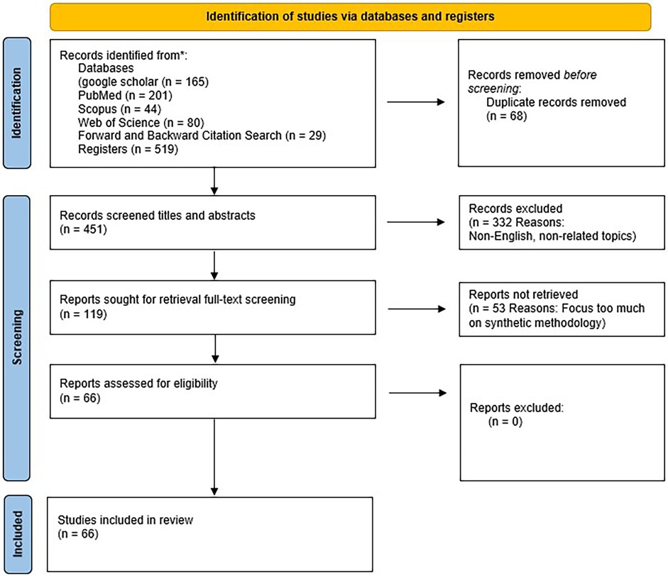Given the broad scope of the topic, the search also employed multiple subsets of keywords to maximise sensitivity and relevance. From an initial pool of 516 studies, 68 duplicates were removed. Titles and abstracts of the remaining studies were screened against pre-defined inclusion criteria, excluding 332 papers. The full texts of 119 remaining articles were then assessed, of which 53 were excluded for not meeting the eligibility criteria. A total of 66 studies were ultimately included in the final analysis. These were included because relatively few publications addressed the four core objectives of this review in an integrated manner. The complete screening results are summarised in Table 1, and the study selection process is illustrated in Figure 1.