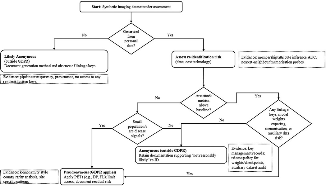 Figure 2. Recital 26 decision tree: is a synthetic imaging dataset anonymous or pseudonymous? Evidence expectations shown in dashed notes.