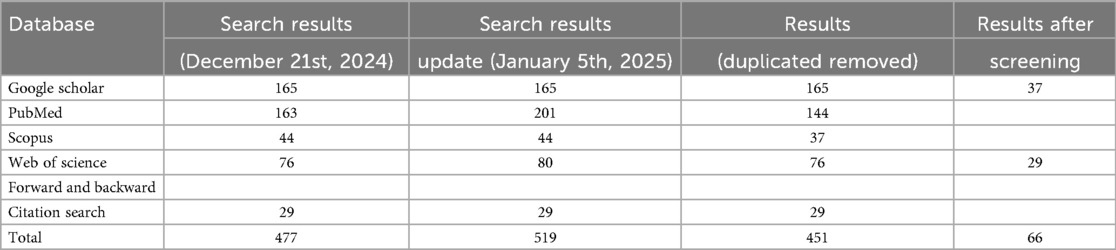 To ensure broad coverage and relevance, a structured search was conducted across four major databases: PubMed, Scopus, Web of Science, and Google Scholar. The initial search was carried out on December 21st, 2024, with an update on January 5th, 2025 to capture any newly added studies. Google Scholar was searched last to capture potential grey literature. In addition to database searches, forward and backward citation tracking was performed by screening the reference lists of included studies to identify further relevant works (leading to the addition of 29 studies).