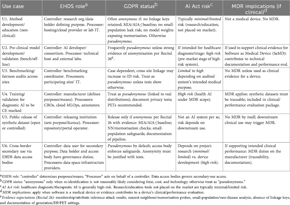 To translate the preceding legal analysis into practice, Table 2 maps common use cases of synthetic imaging data to obligations under the EHDS, GDPR, AI Act, and MDR. Figure 2 provides a Recital 26 decision tree to assess whether a dataset is anonymous or pseudonymous, together with evidence expectations. Unless explicitly noted as cross-cutting, the following mapping is scoped to synthetic medical imaging.