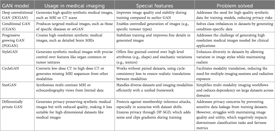 The transformative role of GAN in medical imaging continues to expand, offering benefits that range from data augmentation to enhanced diagnostic precision and privacy preservation. Their versatility extends to generating synthetic data for rare conditions, improving image quality, simulating disease progression, and stress-testing AI models across varied imaging conditions. These capabilities not only enhance model robustness but also contribute to more equitable and generalisable clinical tools. To better understand the landscape of GAN applications in medical imaging, Table 3 summarises key GAN architectures and their corresponding use cases, drawing on recent findings by Kim et al. (5) and Cheng et al. (48).