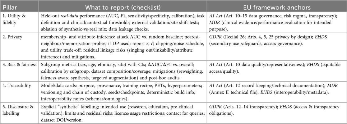 While the ethical and regulatory considerations discussed above provide a conceptual foundation, their translation into actionable practices remains a key challenge. To support alignment with the European Health Data Space (EHDS) objectives, we propose a Synthetic Imaging Data Governance Toolkit (SID-GT). This toolkit serves as a practical checklist for researchers, developers, and data custodians to evaluate synthetic datasets along five essential governance pillars: utility, privacy, fairness, traceability, and disclosure. The toolkit and checklist presented here target synthetic medical imaging; when guidance generalises beyond imaging, this is indicated explicitly. Each pillar is explicitly linked to European regulatory frameworks. including the GDPR, AI Act, MDR, and EHDS regulation, ensuring that governance practices are not only technically robust but also legally grounded. For clarity, Table 5 summarises the proposed governance pillars, associated reporting requirements, and their alignment with key EU regulatory instruments. By embedding these dimensions into evaluation protocols and reporting standards, the SID-GT promotes transparency, accountability, and comparability across projects, facilitating trust and interoperability within EHDS.