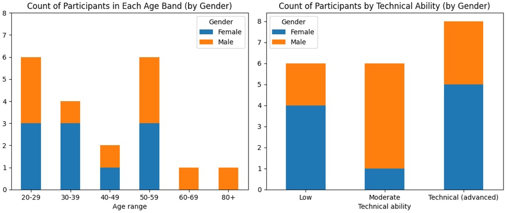 Figure 1. Charts showing the participants’ ages also broken down by gender (left) and participants’ technical abilities also broken down by gender (right).