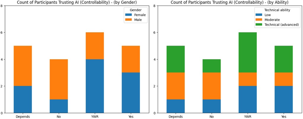 Figure 2. Charts showing the participants’ trust in medical AI and controllability broken down by gender (left) and technical abilities (right). YWR is “yes with reservations”.