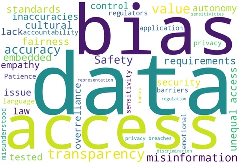 Figure 3. Word-cloud derived from the amalgamated participant response summaries (short-form free text) with stopwords and a small set of common words excluded. Common words excluded include: “may”, “might”, “will”, “use”, “system”, “systems”, “AI”, “medical”, “used”, “healthcare”.