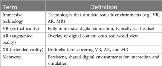 Table 1 outlines the key terminology used throughout the manuscript to ensure consistent and clear reference to various immersive technologies.