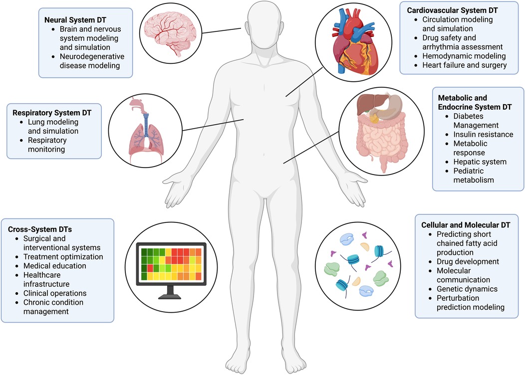 Digital twin (DT), a concept first introduced by Grieves in 2002 as a “conceptual ideal” for product life cycle management, defines the triad of (i) a physical system, (ii) its virtual representation, and (iii) the bilateral information flow that links the physical and the virtual counterparts together [1]. This framework bridges the physical and digital realms, enabling the analysis of past and present processes and facilitating future predictions [2]. Initially developed for manufacturing and aerospace industries [3], DT technology has rapidly evolved to meet the critical demands of modern healthcare.