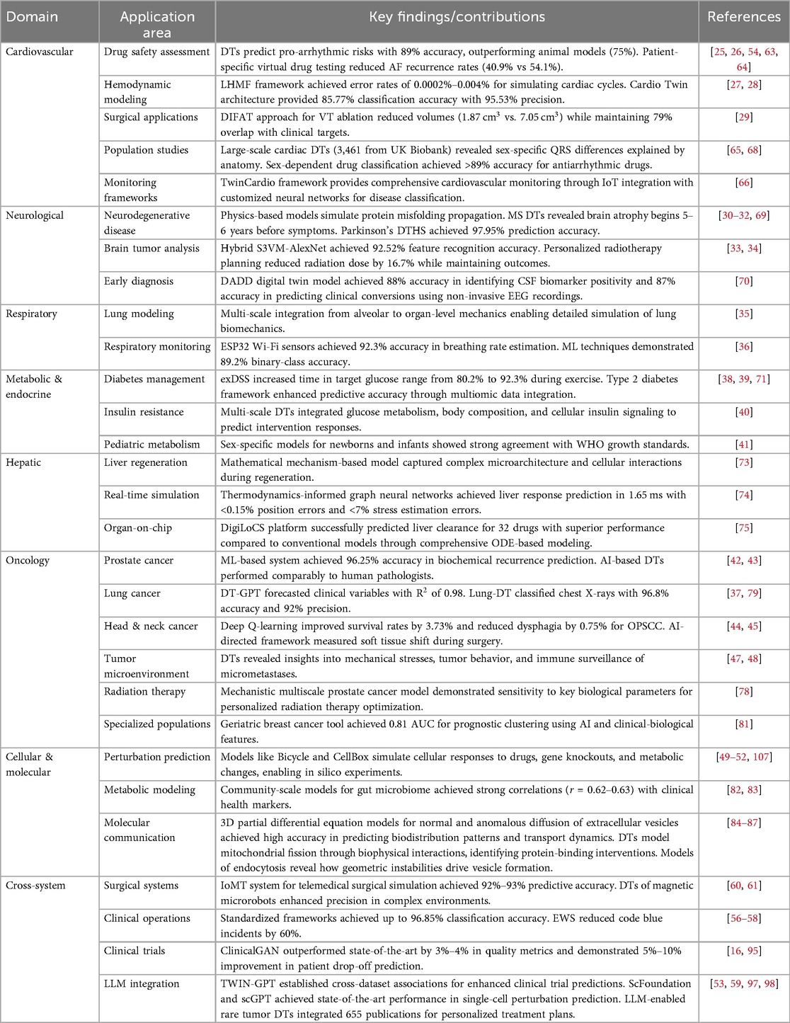 Table 1 and Figure 1 provide a comprehensive overview of the DT applications across different healthcare domains and organs discussed in this review. The table highlights key findings and performance metrics from studies in cardiovascular, neurological, respiratory, metabolic, hepatic, oncological, cellular, and cross-system applications, demonstrating the breadth and depth of DT technology in modern healthcare.
