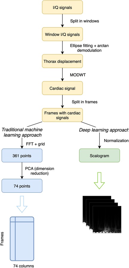 In the deep learning approach, we use the normalized cardiac signal to generate a scalogram for each frame. The result after preprocessing is a scalogram, that visually summarizes the frequency content and time-varying characteristics of each frame. In addition to the scalogram, there are other signal-to-image conversion methods. In [51], the efficiency of several of them was compared for extracting signal features, such as Gramian Angular Field, Markov Transition Field, Recurrence Plot, Grey Scale Encoding, Spectrogram, and Scalogram, where in that case, the scalogram yielded the best results. However, the authors noted that the performance of each method can vary depending on the type of dataset used. While studies on cardiac radar signals are scarce, the scalogram has been extensively and successfully used in the field of ECG, as it performs well with signals sensitive to noise [52–56]. Specifically, the methodology followed in this study is very similar to [16], where ECG signals were converted to scalograms and subsequently classified using CNN and SVM. Given the successful outcomes that the scalogram has demonstrated in this field, we have chosen to apply this method in our study. The complete preprocessing workflow can be observed in Figure 2.