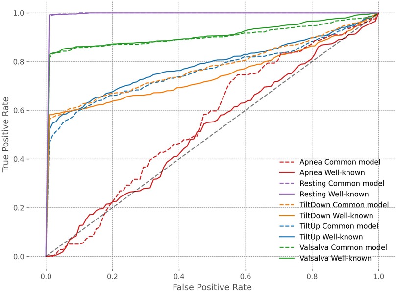 To provide a comprehensive evaluation of biometric system performance, Table 7 reports additional metrics beyond accuracy, including Area Under the Curve (AUC) and Equal Error Rate (EER), both with 95% confidence intervals obtained via bootstrap methods. These metrics indicate that the common model maintains strong discriminative performance in straightforward scenarios such as Resting and Valsalva, with high AUC and low EER. In the underrepresented Apnea scenario, the common model benefits from knowledge transfer across scenarios, showing improved AUC and reduced EER, whereas in Tilt Up, performance slightly deteriorates, with lower AUC and higher EER, reflecting increased confusion between subjects across scenarios. Tilt Down exhibits intermediate behavior, with modest improvement under the common model. These trends are further illustrated in Figure 9, where ROC curves disaggregated by scenario provide a visual representation of the trade-off between true positive and false positive rates across all thresholds. The curves confirm that the common model can enhance identification in underrepresented scenarios such as Apnea, while performance in other scenarios such as Tilt Up may slightly deteriorate. Overall, these results highlight the potential of a unified model to leverage knowledge across scenarios, particularly for scarce data, while also revealing that model performance can vary depending on scenario-specific characteristics.