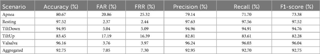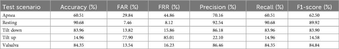 A significant divergence is observed in the results between Tilt Up and Tilt Down. It is important to note that in the Tilt Up scenario, the patient’s lying surface is elevated to and maintained for 10 min, whereas in Tilt Down, the surface returns to a horizontal position, and an additional 10 min are recorded. Unlike other scenarios recorded in a horizontal position, Tilt Up is unique in its almost vertical orientation. Furthermore, the body’s vital organs with the highest blood consumption are predominantly situated in the upper part. The transition from horizontal to vertical may likely induce a more pronounced alteration in cardiac effort compared to the reverse transition. These factors may contribute to the poorer results observed in the Tilt Up scenario, though other factors should not be ruled out. To further investigate this performance drop in the Tilt Up scenario, we analyzed several physiological indicators across the five scenarios. From the available dataset, which contains both ECG and blood pressure in addition to radar-derived cardiac signals, we extracted 30 random segments of 60 s from each subject and scenario, yielding a total of 4,048 samples. For each segment, we computed the mean heart rate (HR), the heart rate variability (HRV, measured as the root mean square of successive differences), and the mean blood pressure (BP). The analysis revealed that Tilt Up is indeed markedly different from the other scenarios: it exhibited a much higher mean HR (82.35 bpm, while all other scenarios ranged between 64 and 70 bpm), a substantially lower HRV (49.84, compared to values around 90–110 in the other scenarios), and the highest mean BP (92.19 mmHg, slightly above the remaining conditions). These differences provide quantitative evidence that Tilt Up constitutes a singular physiological condition compared to the other scenarios. This helps explain why the identification performance in this experimental setting is especially poor for Tilt Up, as the model trained on data from the remaining conditions is exposed to physiological patterns that differ significantly.