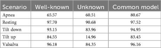 The noteworthy performance for the Valsalva scenario can be attributed to this same fact. Each recording of this scenario includes three 20 s periods of executing the Valsalva maneuver, while the remainder of the time the patient is at rest. Consequently, a significant portion of this scenario aligns with the resting state, leveraging the model’s knowledge.