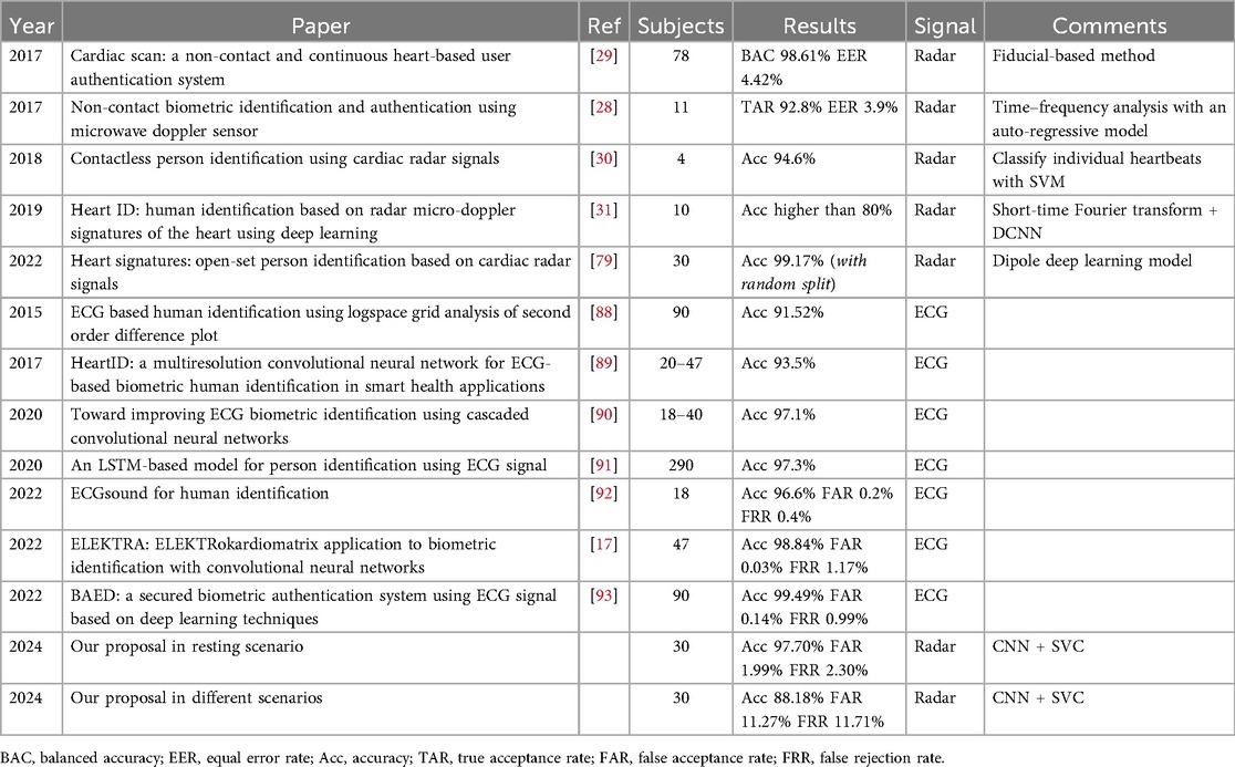 Within the area of cardiac signal detection, one of the initial objectives among researchers was to determine the heart rate using different techniques such as Fast Fourier Transform (FFT), Auto-Regressive Model (AR), or the detection of each single beat [27, 28]. But already in 2017, in [29], a method for identification based on the identification of the cardiac signal by a Continuous Wave (CW) radar was developed based on a fiduciary analysis of the cardiac signal. Fiduciary analysis refers to a method of signal processing or data interpretation that relies on distinctive fiducial points or features within the signal. These points serve as reference markers, aiding in the identification and extraction of specific information. On the other hand, non-fiduciary analysis involves alternative approaches that may not rely on specific fiducial points, often exploring broader characteristics or patterns within the signal for analysis. In this study, in order to avoid unwanted Random Body Movement (RBM), two radars are placed on each side of the patient. As a classifier, they use k-Nearest Neighbors (KNN) and SVC, obtaining a 98.61% balanced accuracy. In [30], instead of conducting a fiduciary analysis of the signal, the signal is segmented into individual heartbeats and resampled to a fixed number of samples. These samples are then fed into the classification algorithm. Each window is classified by the beats it contains through voting. However, the study is conducted on only a sample of 4 people. More recently, in [31], they transform the signal with Short Time Fourier Transform (STFT), creating spectrograms that are then classified with a Deep Convolutional Neural Network (DCNN).