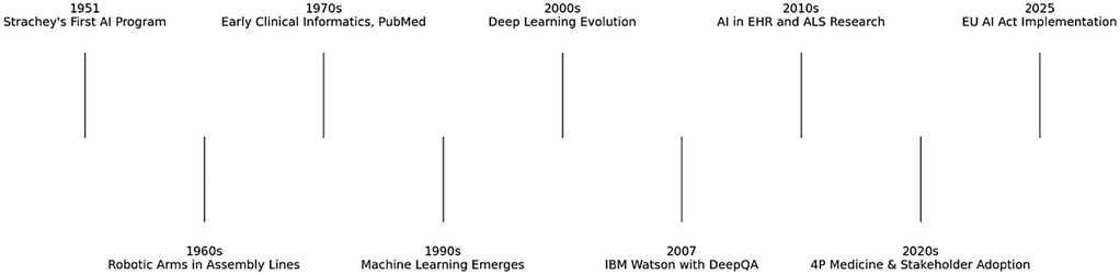AI has significantly evolved since the first AI program was developed by Christopher Strachey in 1951. It was initially mainly an academic research topic and in the following two decades, there were great innovative advances in engineering such as electronic arms in assembly lines and the first simple robot able to follow basic instructions (6). Despite this progression, medicine was slow to adopt this technology during this period. There were however major advancements in medicine during this time which would help establish the foundations of AI in medicine in the future; these include the development of medical record systems and clinical informatics databases (8). The web-based search engine PubMed was created in this time by the National Library of Medicine and was a fundamental digital resource which facilitated the acceleration of biomedicine as we know it (8) (Figure 1).