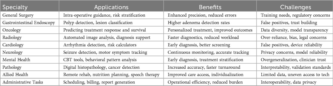 We conducted a literature search in Ovidmedline up to July 2025. Search terms included combinations of “artificial intelligence,” “machine learning,” “deep learning,” “large language models,” “generative AI,” “digital health,” and “healthcare” alongside specialty-specific terms such as “surgery,” “radiology,” “mental health,” “allied health professions,” “ethics,” “regulation,” and “clinical applications.” Boolean operators (AND, OR) were used to refine results. Priority was given to peer-reviewed articles published between 2018 and 2025 that provided novel insights, multidisciplinary perspectives, and coverage of underrepresented domains such as allied healthcare and AI regulation.