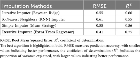 A more restrictive threshold than the one adopted (e.g., 3 missing values) would have led to the exclusion of a substantial number of subjects, significantly reducing the amount of data available for model training. To impute missing values, we used the 93 fully observed cases to train and test various imputation models. The model that achieved the best performance on the test set (shown in Table 1) was then applied during the inference phase to estimate the missing values in the remaining 223 subjects. Following imputation, 316 complete cases were obtained. While it is well known in the literature that imputation may introduce some degree of bias, in real-world scenarios where ideal, (gold standard) data are not available, it remains a valuable approach to enable the development and validation of predictive ML and Deep Learning models (28). Specifically, we employed the Iterative Imputer with an Extra Trees Regressor estimator (29) due to its ability to handle non-linear relationships within the data. The method iteratively predicts missing values by modeling each incomplete feature as a function of the other features. This process repeats until the imputations stabilize, ensuring consistent and reliable estimates. To assess the performance of this approach, we compared it with several other imputation methods, including Iterative Imputer with a Bayesian Ridge estimator (30), K-Nearest Neighbors (KNN) Imputer (31), and Simple Imputer (mean strategy) (32). Each method was implemented and evaluated using the Root Mean Square Error (RMSE) and the Coefficient of Determination (R2), which are explained more in detail in the paragraph 3.3. These metrics calculated between the imputed values and the observed values in complete cases.