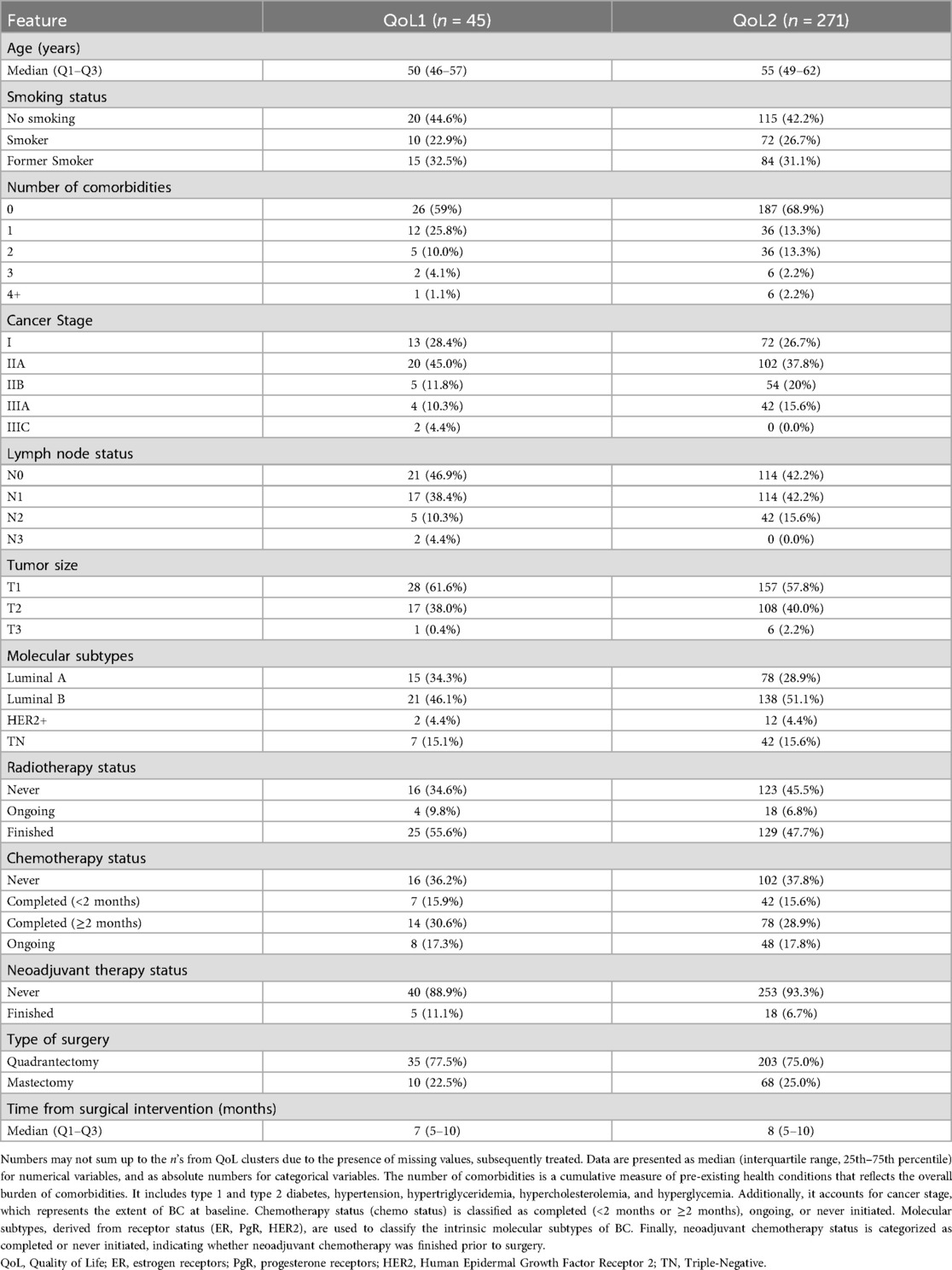 Following imputation, the hierarchical clustering algorithm automatically detected two main QoL-oriented groups (QoL1 and QoL2) (Figure 1a). QoL1 (n = 45) showed more variability compared to QoL2 (n = 271) (Figure 1b); regarding trends, the QoL2 group showed greater stability and higher scores (Figure 1c) and it was adopted for our further analysis. The Mann–Whitney U-test confirmed statistically significant differences between the two clusters (p < 0.001). The post-hoc analysis revealed that 80% of patients in QoL1% and 69% in QoL2 had imputed values. The relatively modest difference between the two groups supported the validity of the clustering approach, demonstrating that the algorithm identified patient groups based on HRQoL patterns rather than data completeness. Table 2 provides a detailed comparison between the two QoL clusters in terms of clinical profiles, highlighting distinctive patterns among patients with different HRQoL trajectories.