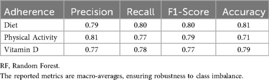 The optimal hyperparameters identified for the three RFs and the XGBoost model used for the prediction task are summarized in Supplementary Tables S2a,b. The evaluation metrics for the three RFs trained to predict future AD_DIET, AD_PA, and AD_VITD are summarized in Table 3. The highest accuracy was achieved by the model predicting AD_DIET (0.81), followed by the model for AD_VITD (0.79) and AD_PA (0.71).