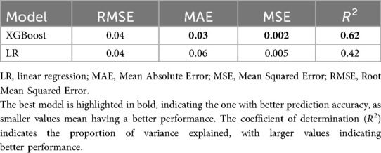 On the right side of Figure 2, the confusion matrices are shown. In all three models, the BL characteristics were found to be less related to the outcomes. A comparison between the XGBoost model and the multivariable LR on predicting the mean HRQoL score over the following 9 months is presented in Table 4. The XGBoost model demonstrated superior performance across all metrics, with an R2 of 0.62 compared to 0.42 for the LR model, underscoring the enhanced predictive capability of non-linear methods in modeling complex health outcomes. Notably, the Bland-Altman analysis (Figures 3b,c) revealed a strong difference in predictions between XGBoost and LR. Specifically, plot Figure 3b shows a good agreement without systematic drift, with minimal differences randomly distributed around the mean difference line; plot Figure 3c exhibits a negative drift, indicating that the model tends to underestimate predictions as mean of the measurements increases.