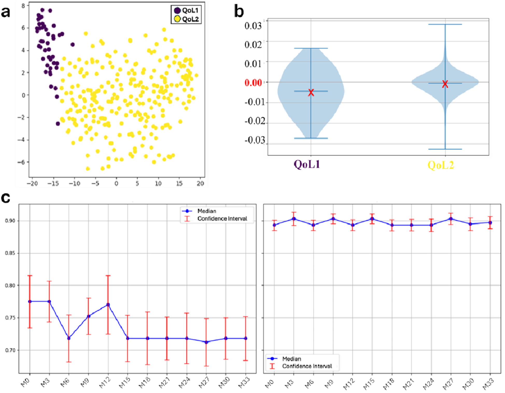 Results from clustering algorithm and trend analysis among the two HRQoL groups throughout the 9 months period: (a) scatter plot; (b) HRQoL slope distribution by groups. The red X marks the mean slope within each group: negative mean values indicate a decreasing trend over time, whereas values close to zero suggest overall stability. (c) QoL trends among the groups. The red bounded bars represent the 95% confidence interval for each single mean point. After imputing missing values, all the HrQoL measures were used for clusering. QoL, Quality of Life; HRQoL, Health Related Quality of Life.