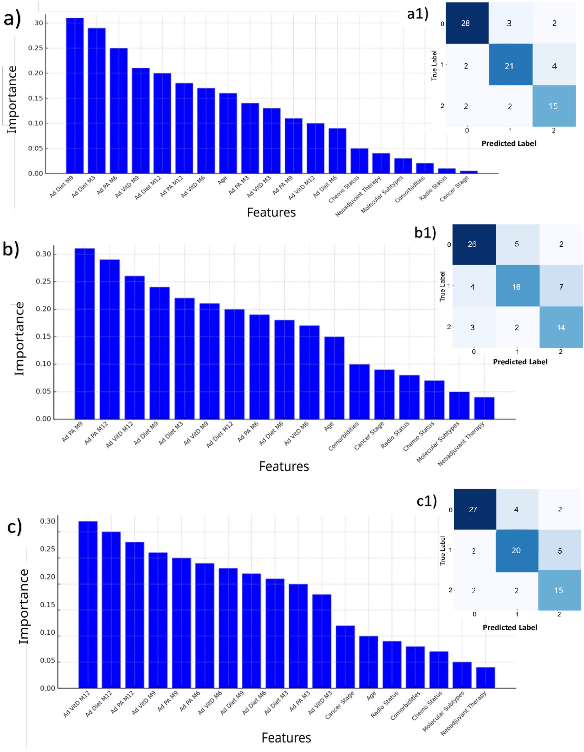 To answer RQ1, we approached the adherence prediction as a multi-label time series classification task, with patient compliance for each advice category (diet, PA, and supplemental vitamin D) recorded at each trimester on a discrete scale of 1–3. Specifically, three separate Random Forest classifier (RF) models were developed, each one for a single specific outcome: future adherence to one of the three recommendations. These models utilized a comprehensive input dataset, which included temporal adherence patterns for diet, PA, and vitamin D supplementation recorded during the first year of the program (M3, M6, M9, and M12), combined with BL characteristics (age, cancer stage, molecular subtypes, radio-, chemo-, neoadjuvant therapy status, comorbidities). The target label for each classifier represented the most frequently recorded adherence value in its respective category during the subsequent nine-month period and was treated as a classification problem. Although the input data remained constant across models, each classifier was tasked with predicting a different target variable, specifically the future adherence to one of the three recommendations. To answer RQ2, we employed an XGBoost, a gradient boosting regressor, chosen for its effectiveness with continuous outcomes (34). This algorithm is part of supervised regression ensemble models adopting a Decision Tree (DT) sequence: the algorithm works by adding a new DT to the former ones to minimize the regression error, which was the residue of that series. XGBoost incorporated BL values and QoL time series data from the program's first year to forecast the average QoL score by the one-year treatment. A linear regression (LR) model was fitted as a reference algorithm to compare the performances of the former one. We performed a 70/30% train/test split on our dataset to prepare it for model training and evaluation. This split allowed us to use 70% of the data for training the models and 30% for testing their performance on unseen data. All samples were uniquely assigned to either the training or the test set. The split was carried out randomly to avoid selection bias, ensuring that the distribution of the target variable was preserved across training and test sets. We adopted a k-fold cross validation on the training data to assess the best tuning of algorithms, namely that set of hyperparameters, chose from a wide possibility of combinations (often set in a grid), which are associated with the highest performances. For each combination of hyperparameters, data are split into random k equal folds of observations: each part is further divided into k − 1 parts dedicated to fit the algorithm while the kth part is used to measure its performances. The best combination of hyperparameters is the one to be finally chose for the final algorithm. We used k = 5 as default value from the sci-kit learn method in Python. A fixed random seed was applied to ensure the reproducibility of the experiments.