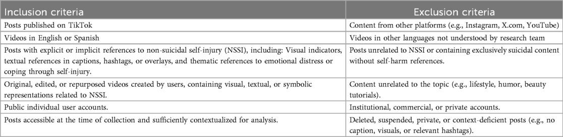 Posts were included if they contained explicit or implicit references to NSSI, operationalized as visual indicators (e.g., scars, fresh wounds, tools associated with self-injury), textual cues in captions or hashtags, thematic references (e.g., emotional pain, self-harm, recovery, relapse). Duplicates, off-topic content, or videos lacking sufficient contextual information were excluded (see Table 1).