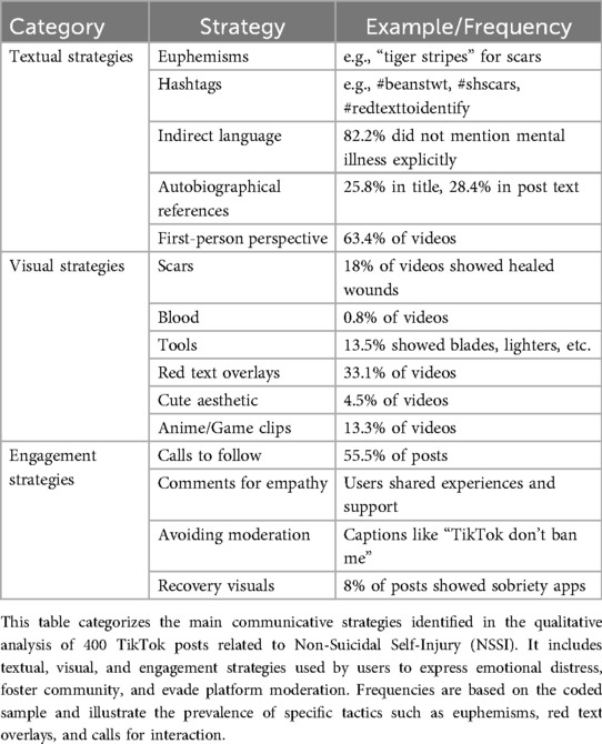 It must be noted that TikTok's official policy prohibits content that promotes, glorifies, or normalizes Non-Suicidal Self-Injury [NSSI]. According to its Safety & Privacy Guidelines (28), the platform removes content that depicts or encourages self-harm, while allowing posts that aim to raise awareness or provide support, provided they do not include graphic imagery or methods. Despite these policies, our findings show that users often employ coded language and symbolic visuals, commonly referred to as “algospeak”, to evade moderation and maintain visibility within NSSI-related communities.