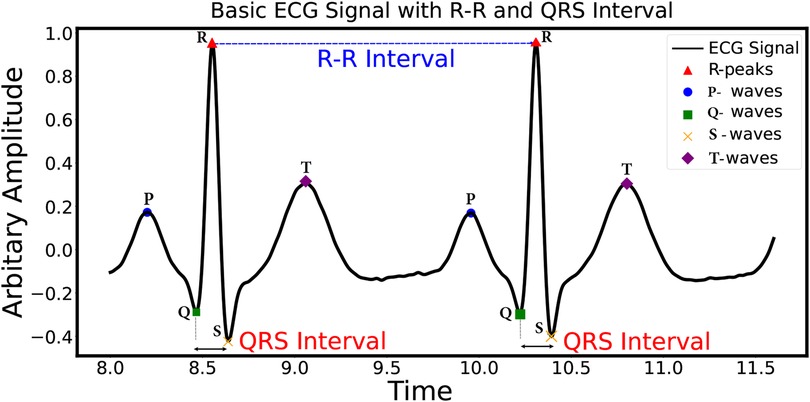 Figure 1 illustrates the primary ECG signal, composed of the following characteristic waves: the P-wave, QRS complex, T-wave, and U-wave (1). These characteristic waves are crucial for identifying the state of the heart’s functioning. As per the Physionet arrhythmia database, there are 17 different types of ECG beats. These categories cover a wide range of arrhythmias, aiding in the comprehensive analysis and classification of ECG beats (8). These 17 different types of ECG beats are further sub-categorized into five classes, i.e., non-ectopic beat, supraventricular ectopic beat (S), ventricular ectopic beat (V), fusion beat (F), and unknown beat (Q), as per the American Association for the Medical Instrumentation (AAMI) (8). Among these ECG beats, S and V are clinically crucial, as these are sources of sudden heart attacks (9).