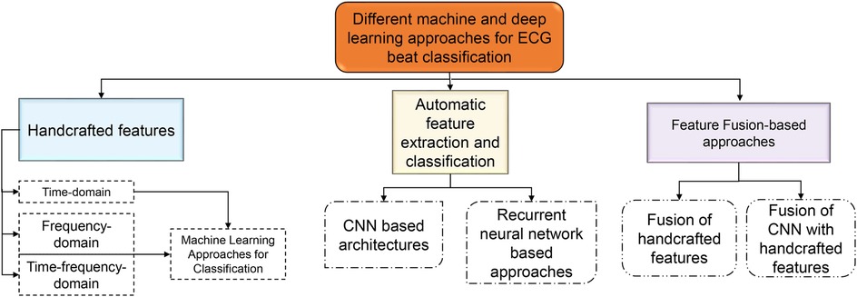 Machine learning (ML) algorithms are becoming popular for effective classification of ECG beats (18, 19, 22–28). Hierarchical representations of the latest ECG beat classification techniques based on machine and deep learning (DL) techniques have been reported in the literature, as shown in Figure 2. Handcrafted features are required to detect the type of ECG beat when using machine learning techniques (22–24). Most handcrafted features are extracted based on time, frequency, and time-frequency domains (29, 30). Time-domain features alone are not sufficient for effective ECG beat classification; together with this, the frequency-domain features increase beat detection performance (11, 29). In addition, features based on time and frequency are more effective than individual features in the time and frequency domain (31). Handcrafted approaches rely on manual feature engineering, where domain knowledge is used to design and extract features from ECG signals. This process can be time-consuming, involving the design of algorithms and signal processing techniques to extract meaningful features (5). Handcrafted approaches require selecting relevant features that capture the discriminative information from the ECG signals. Identifying the most informative and robust features is non-trivial and often requires domain expertise (32). Choosing inappropriate features or excluding important ones can lead to suboptimal classifier performance. Handcrafted feature sets may not generalize well to new or unseen data that significantly differ from the training data. ECG signals vary considerably due to age, sex, underlying conditions, and noise (33). The classification accuracy may be compromised if the handcrafted features do not represent the new data. ECG beat classification involves capturing complex relationships and patterns within signals. Handcrafted approaches may struggle to capture these intricate relationships, as they typically rely on pre-defined algorithms and feature engineering techniques. These problems have motivated researchers to develop automatic feature extraction approaches.